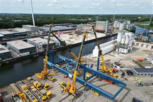 Large gantry crane installation by Dutch specialist using four wheeled cranes in unison