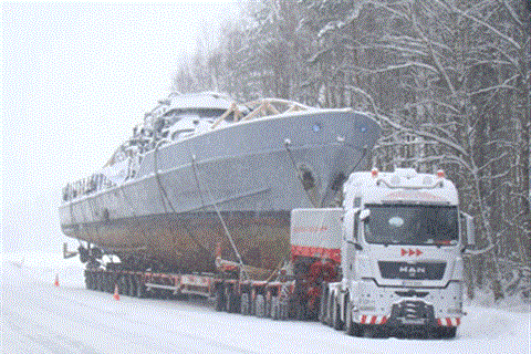 A decommissioned minesweeper was transported across Finland by Nurminen Logistics using a 680 hp four-axle MAN tractor and 10-axle Goldhofer modular trailer