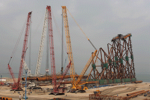 A 1,000 tonne capacity XCMG crawler crane and a 1,250 tonne capacity Terex crawler worked together in the construction of an offshore oil platform in Penglai, Shandong Province, China